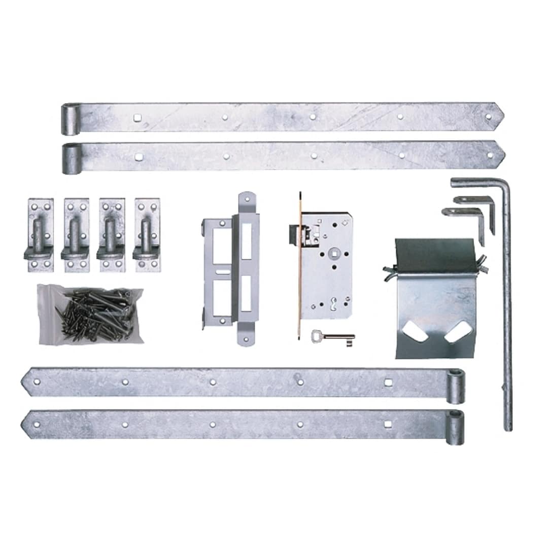 composé de : 4 charnières de volet 16/700, 4 crochets D1/16, 1 serrure à mortaise utilisable à droite et à gauche, 1 gâche d'arrêt réglable, 1 coulisseau de sol, 1 assortiment de vis ; emballé dans du carton